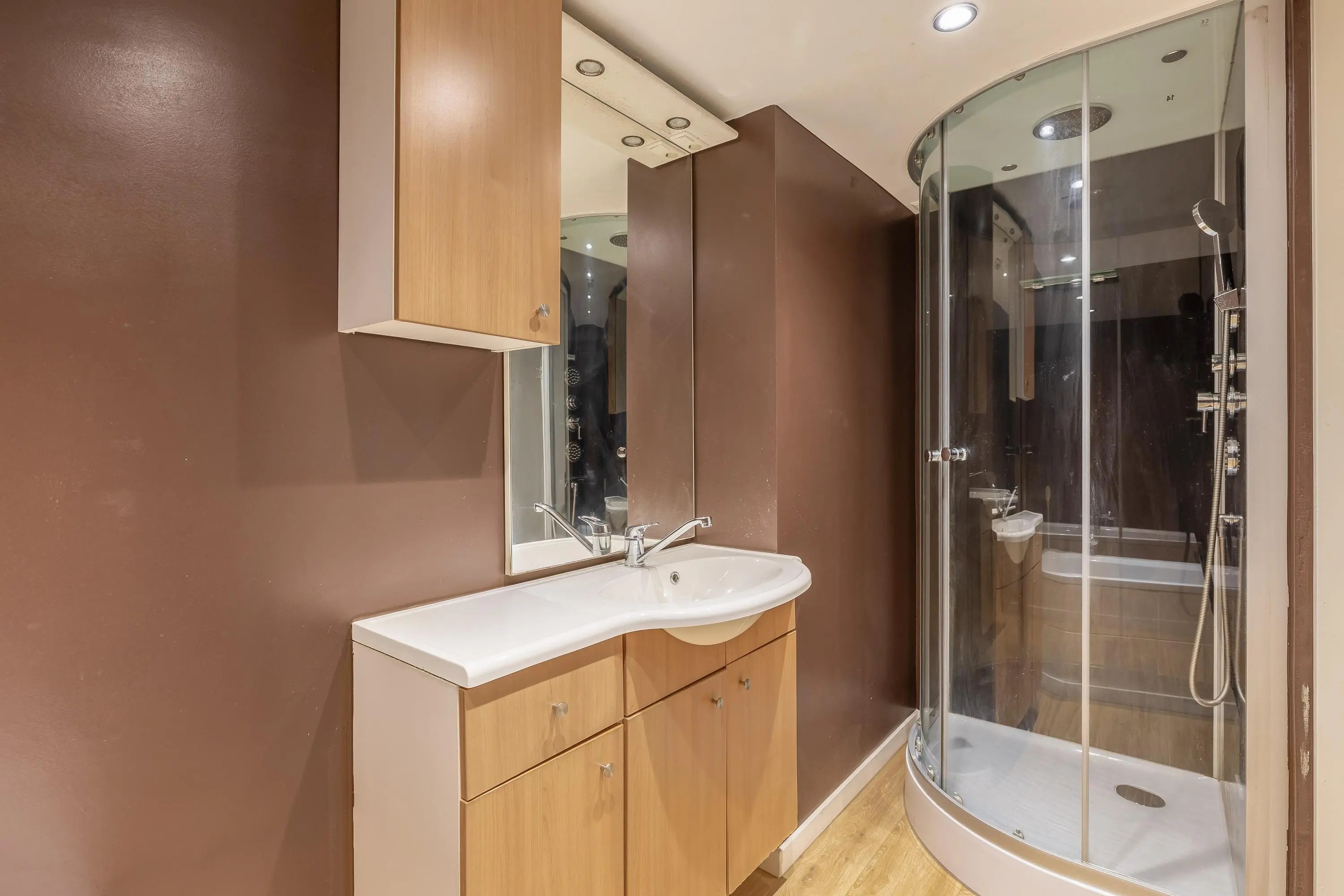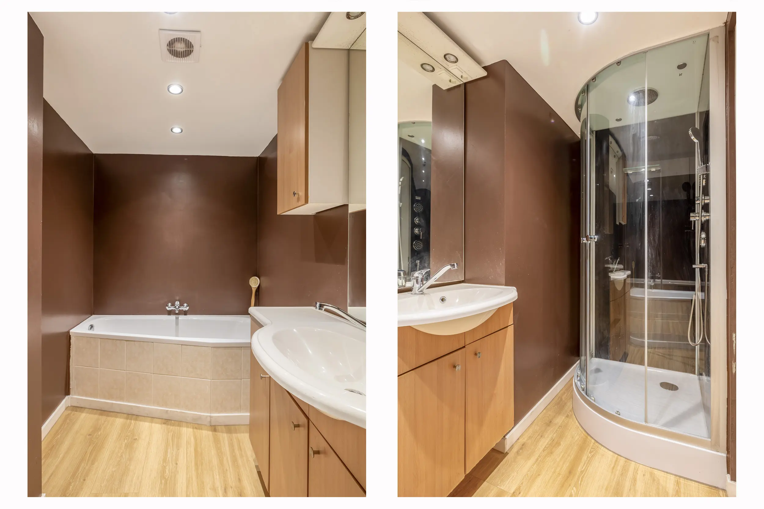 De badkamer is uitgerust met een douchecabine, ligbad en wastafelmeubel.