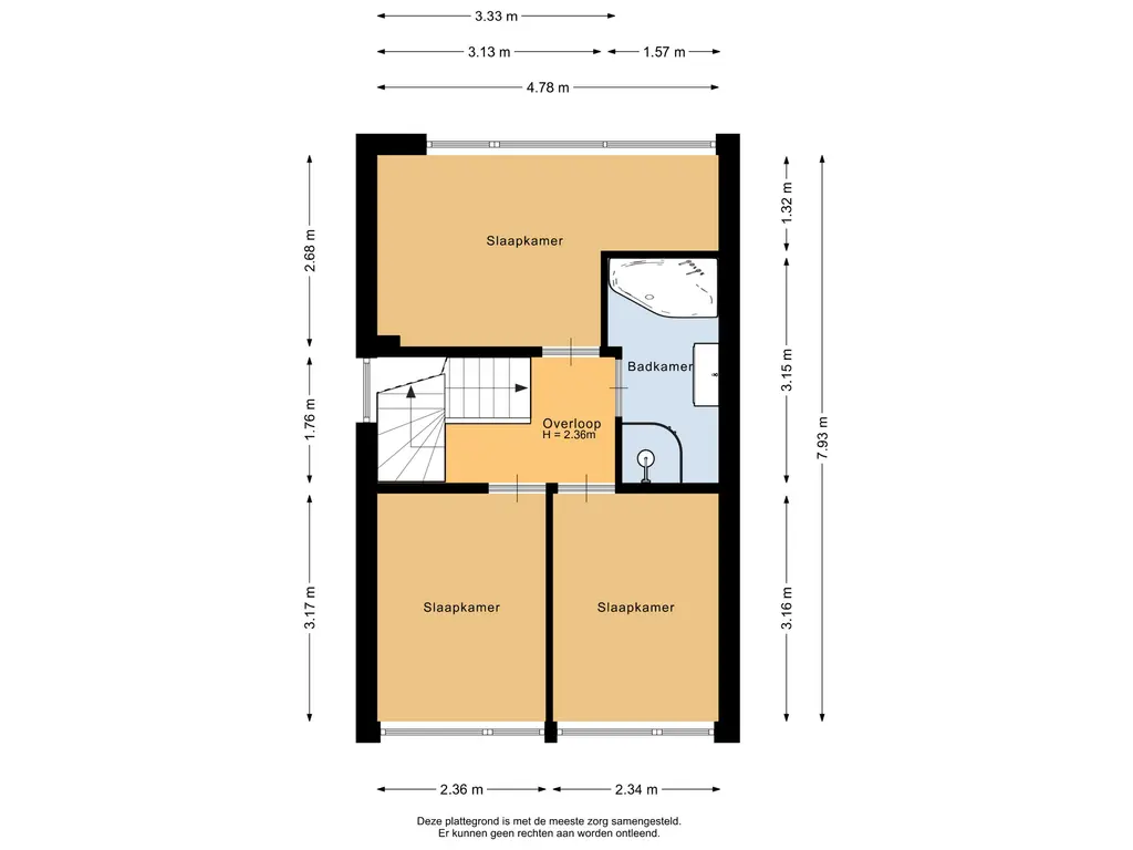 De hoofdslaapkamer bevindt zich aan de achterzijde en heeft een oppervlakte van circa 13m². De twee overige slaapkamers liggen aan de voorzijde en meten elk ongeveer 7,5m².