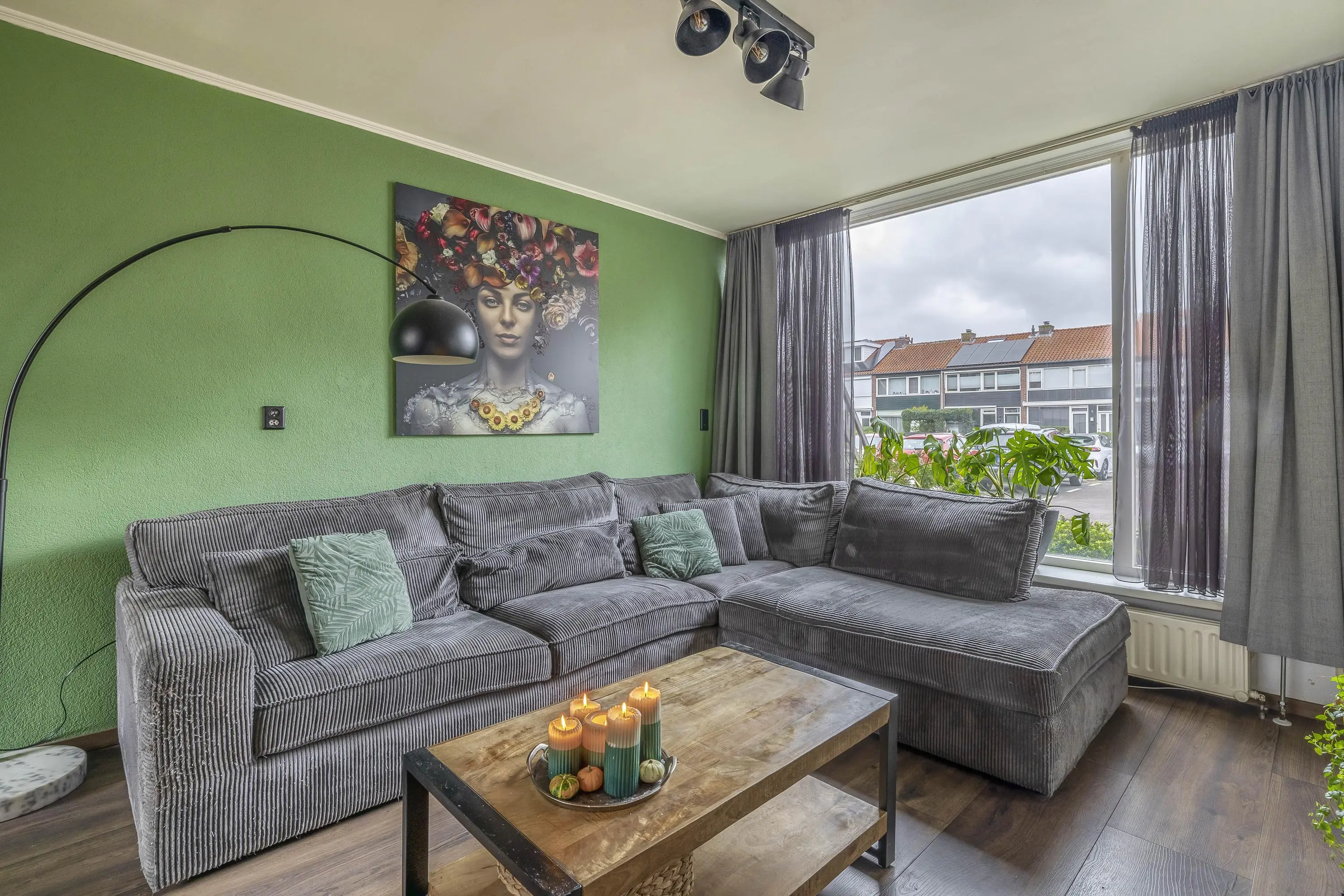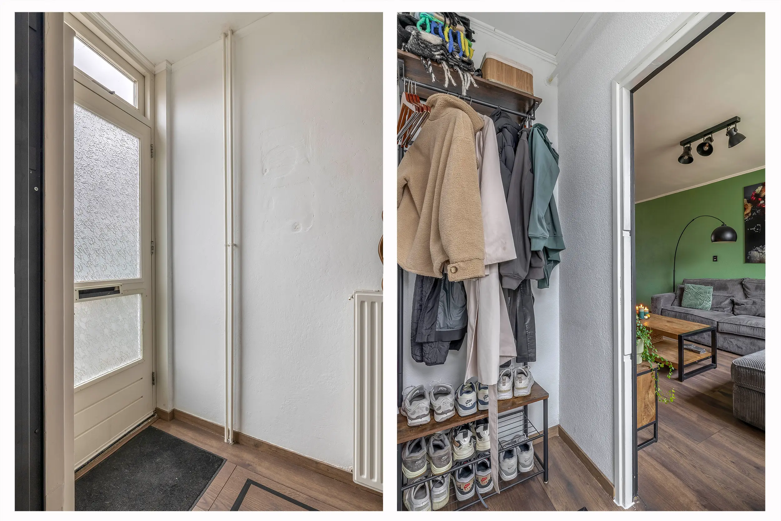 Bij binnenkomst komt u in een verzorgde hal met een nette laminaatvloer, die doorloopt over de gehele begane grond, met uitzondering van de keuken. Vanuit de hal heeft u via een stijlvolle stalen deur toegang tot de ruime en lichte leefruimte.