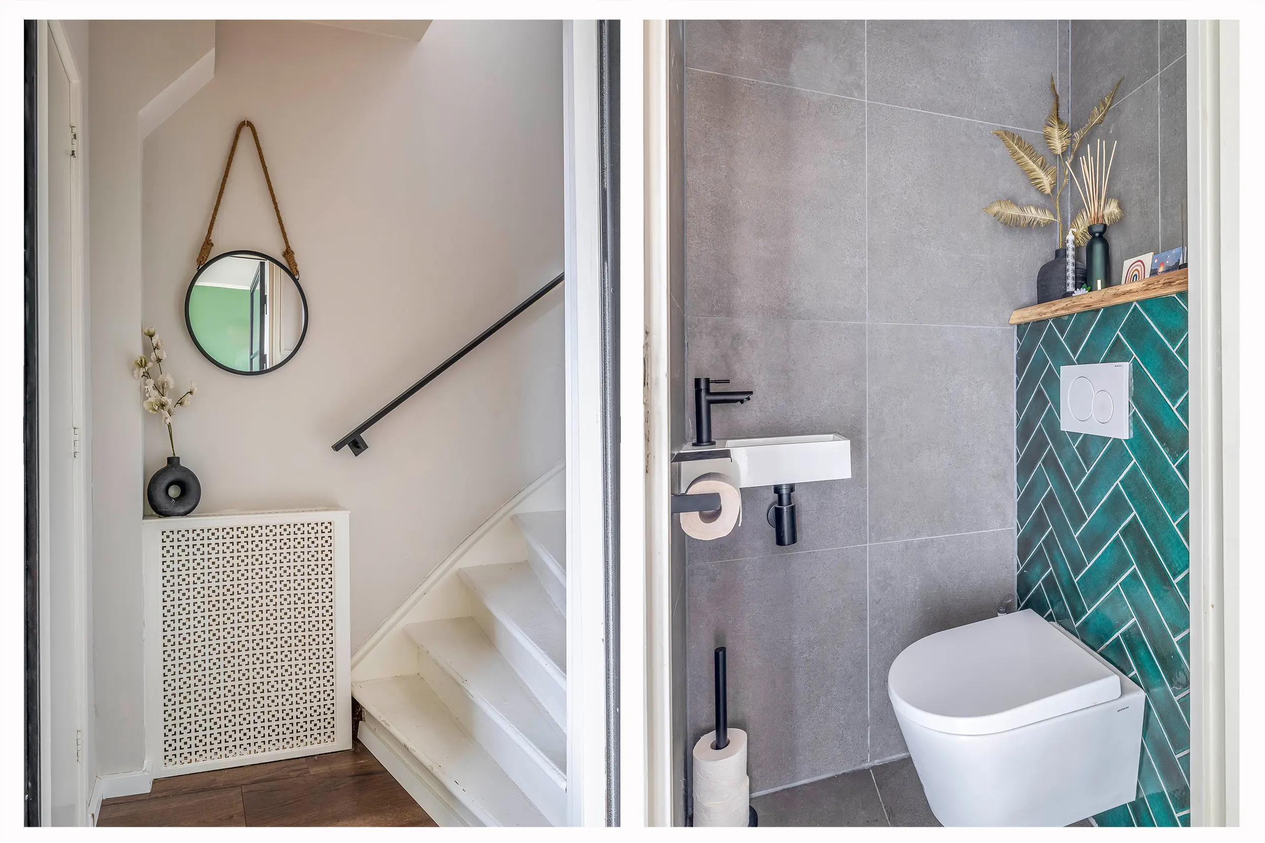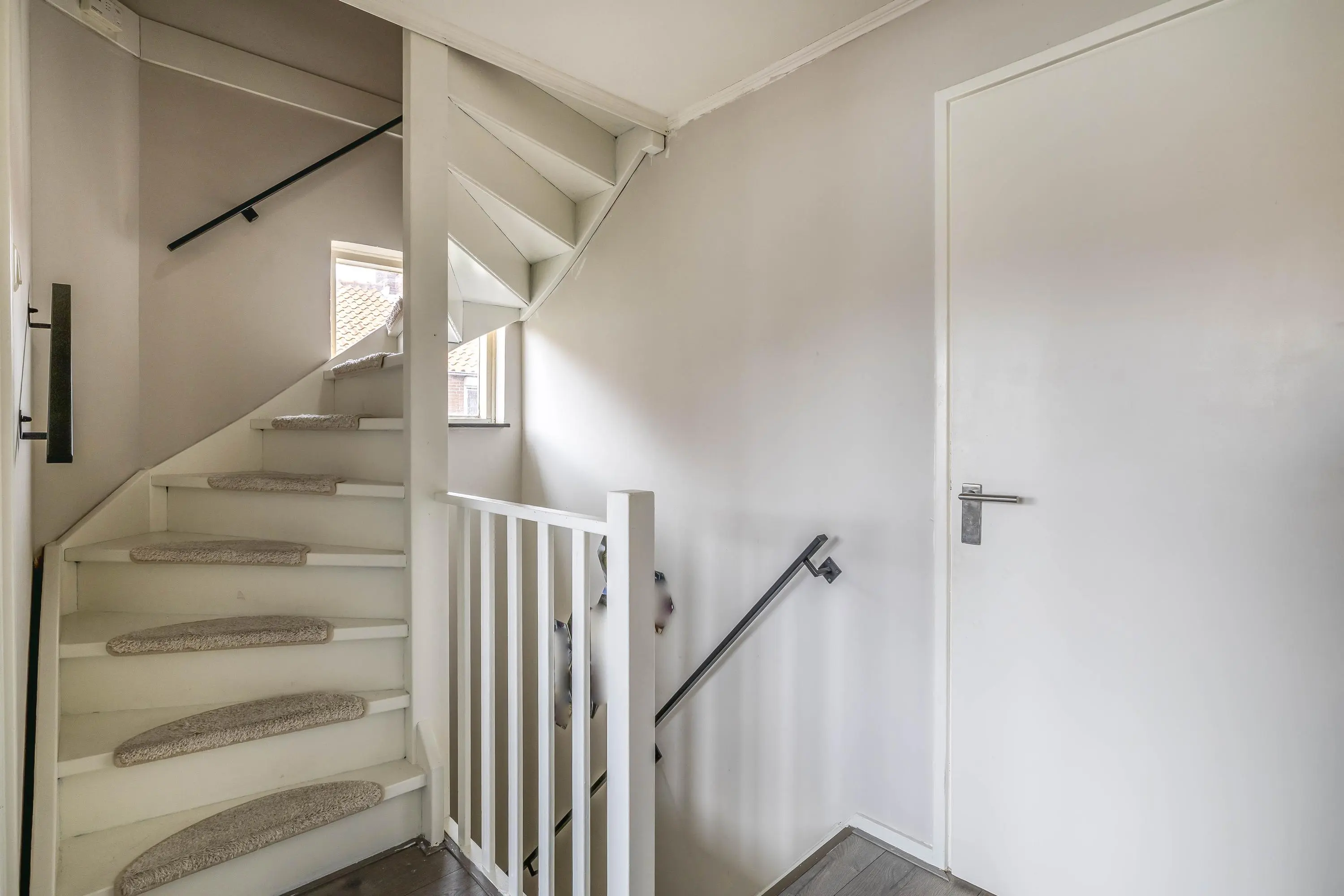 Via een tweede stalen deur bereikt u de tussenhal, waar zich het moderne, in 2023 vernieuwde, separate toilet bevindt. Hier vindt u ook de trapopgang naar de eerste verdieping.