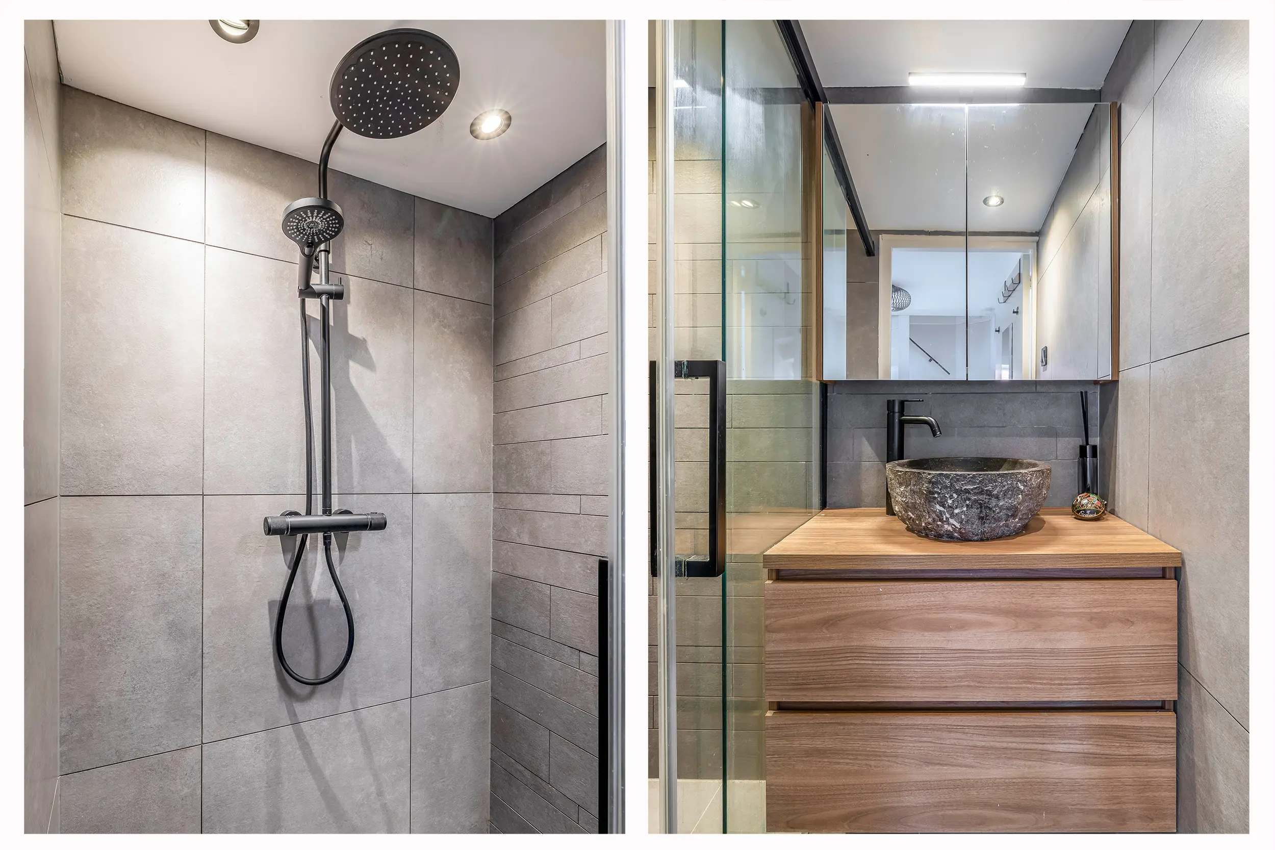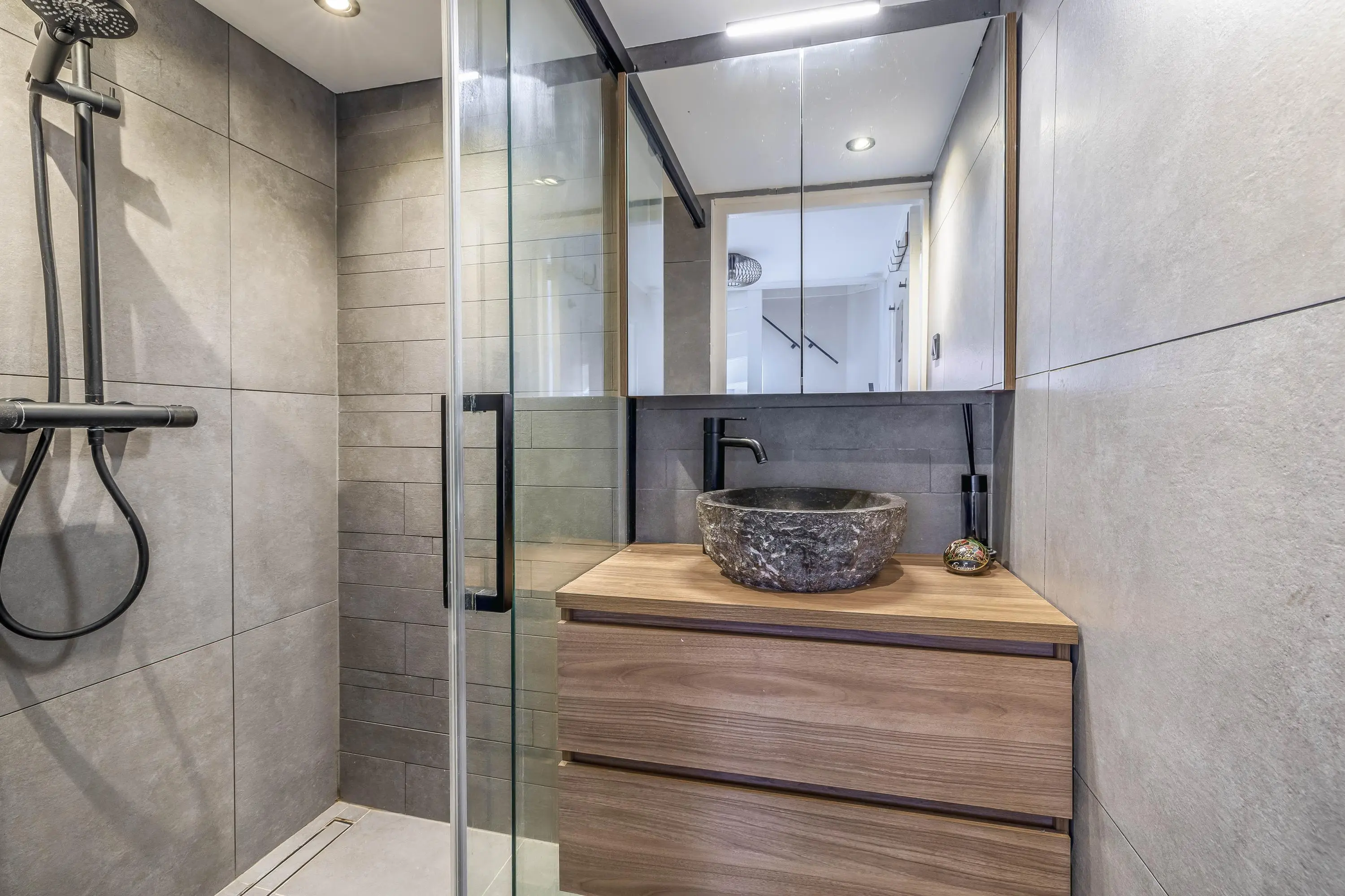 De moderne badkamer (2023) is stijlvol uitgevoerd en uitgerust met een douche met regendouchekop en een fraai wastafelmeubel.