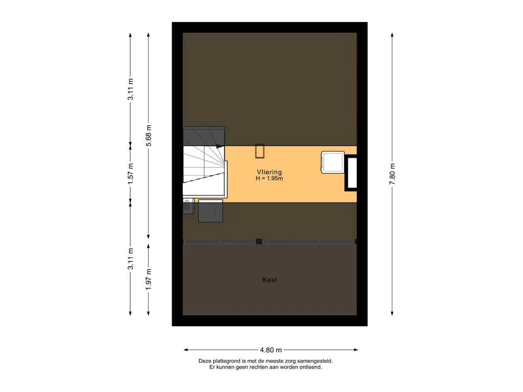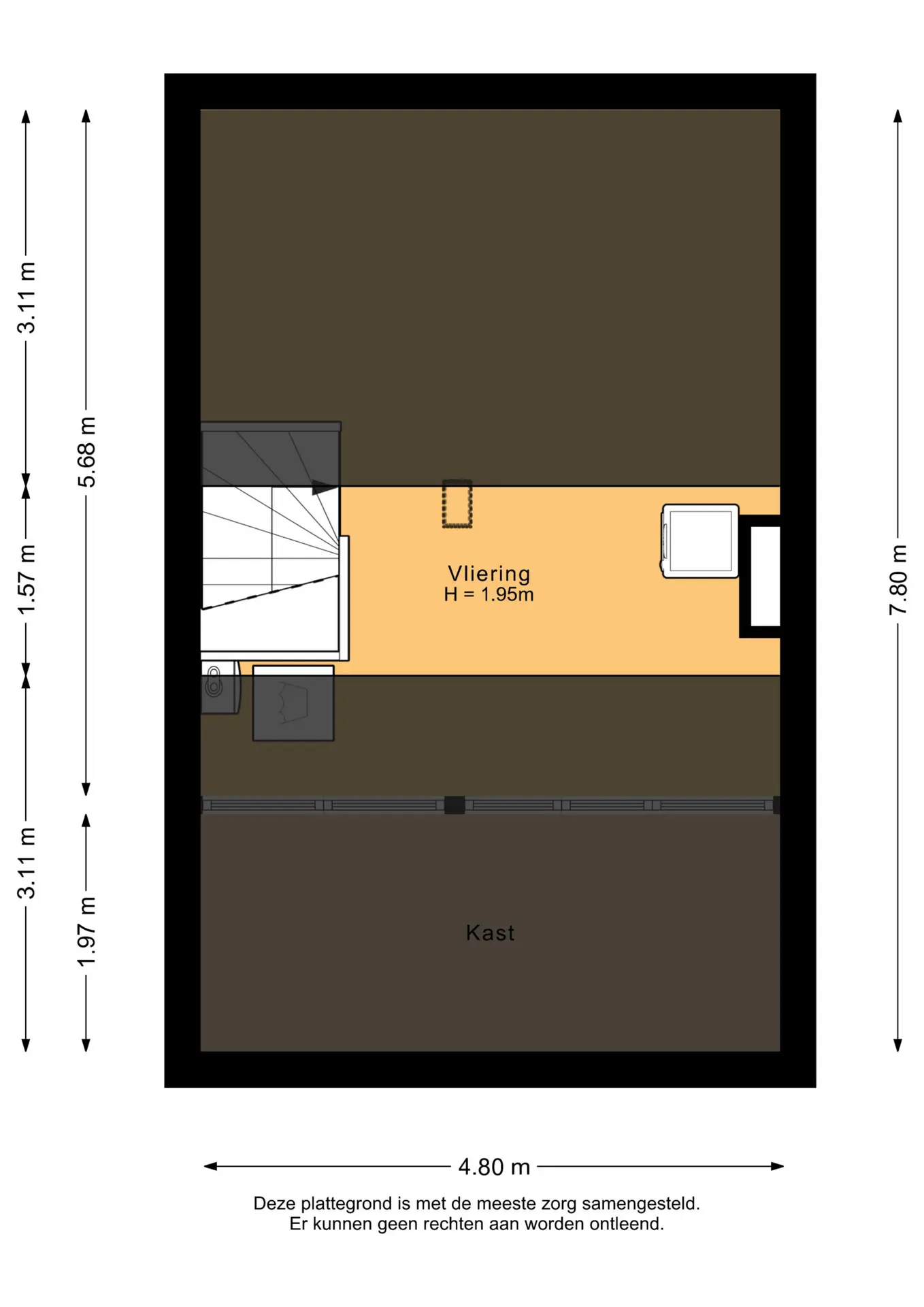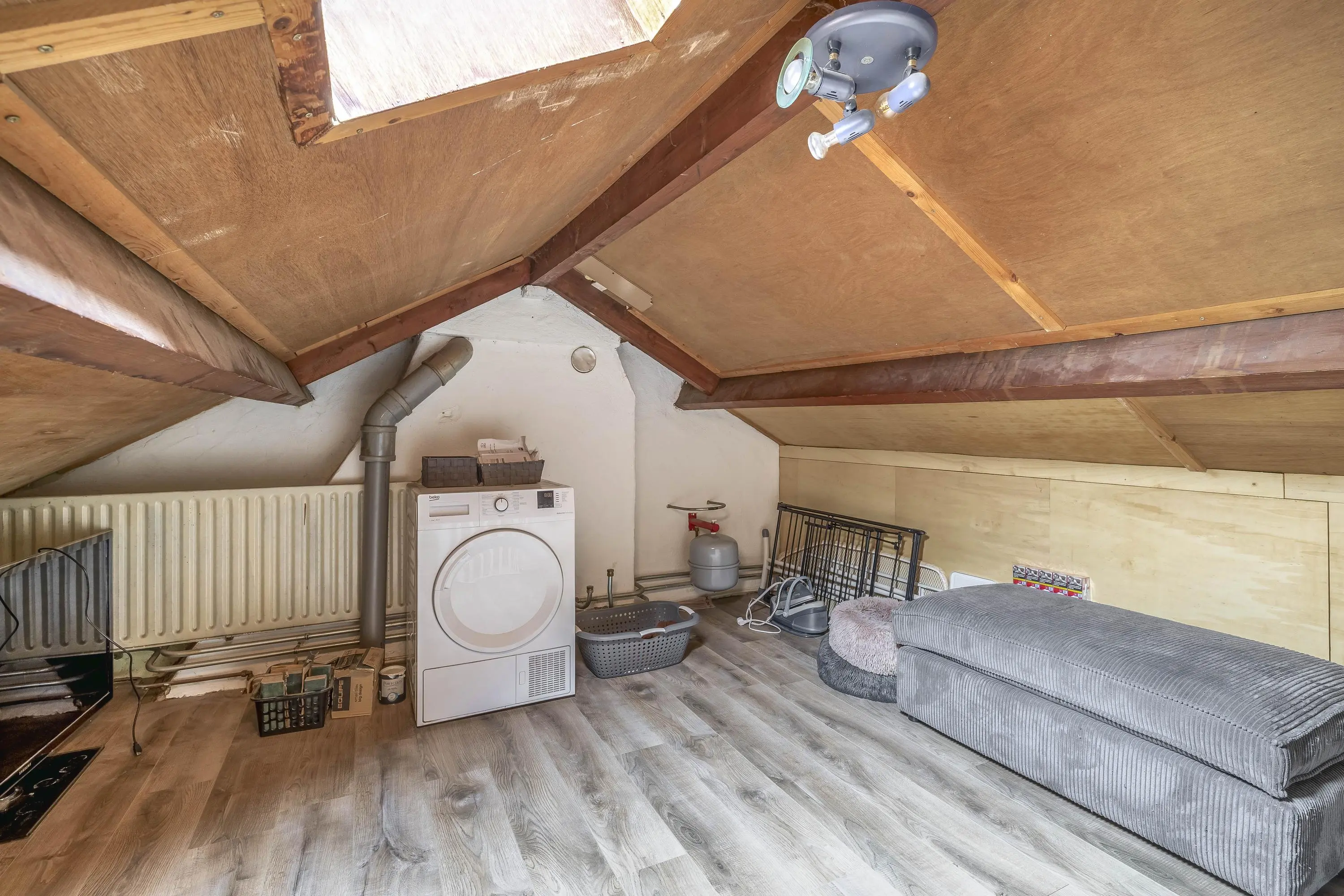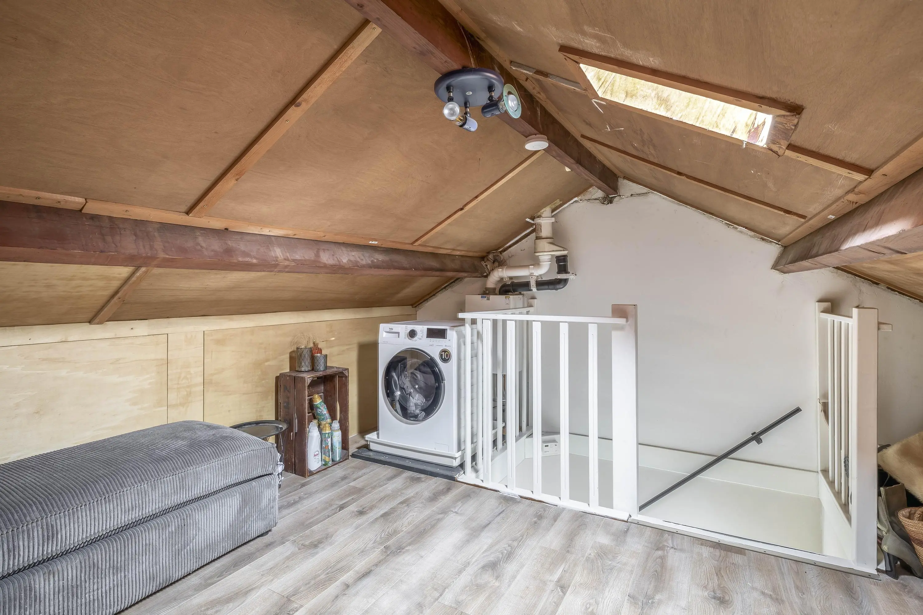 Op de tweede verdieping bevindt zich een ruime vliering, bereikbaar via een vaste trap. Hier treft u de opstelling voor de cv-ketel en de aansluitingen voor wasmachine en droger. Dankzij het dakraam is er natuurlijk licht en de knieschotten bieden praktische opbergruimte.