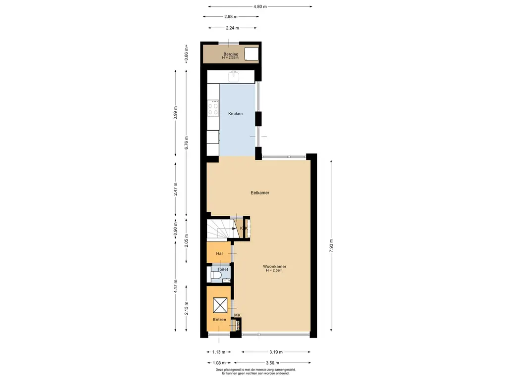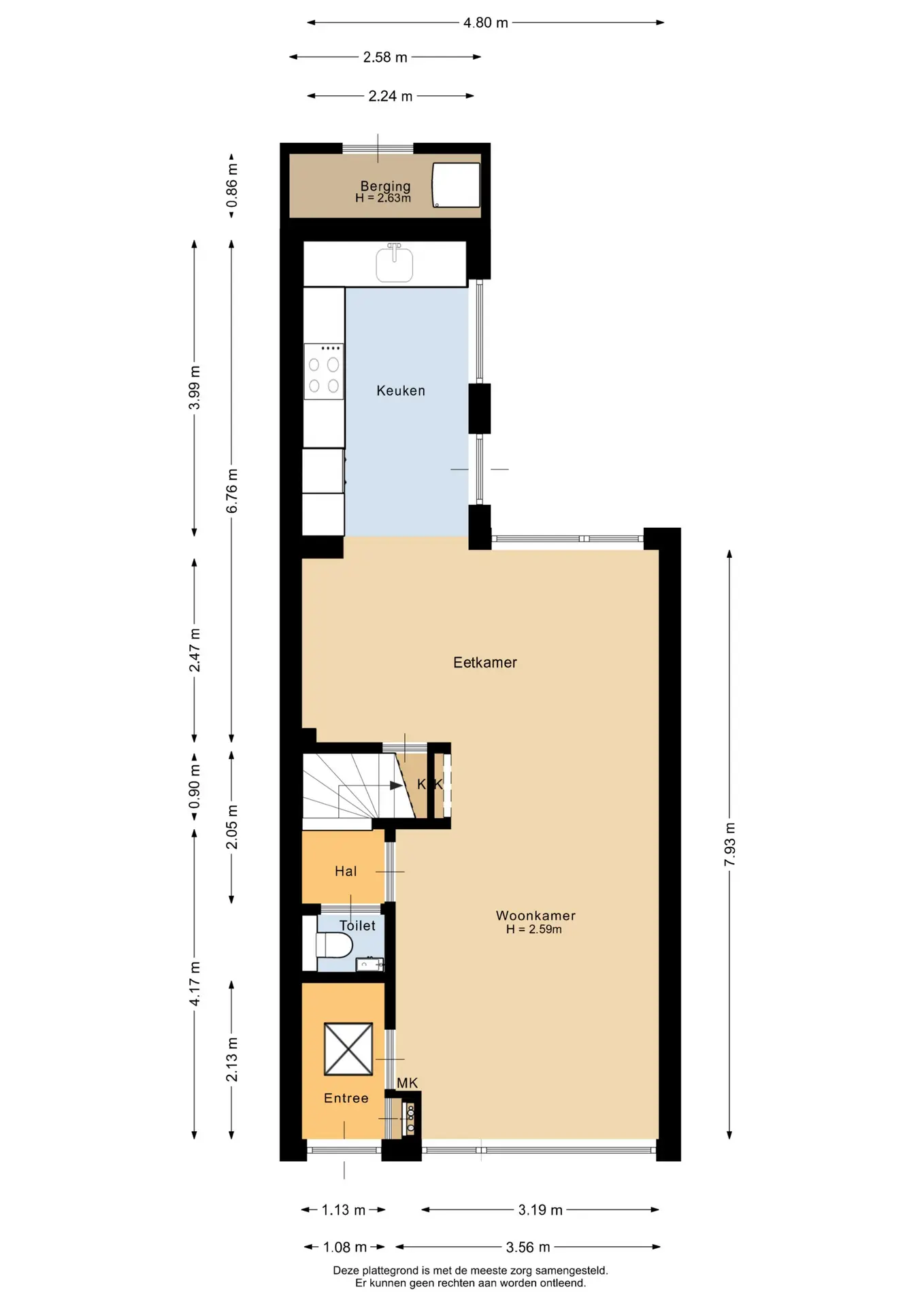 In het eetgedeelte bevindt zich een handige trapkast voor extra bergruimte. Vanuit hier loopt u door naar de aangebouwde keuken.