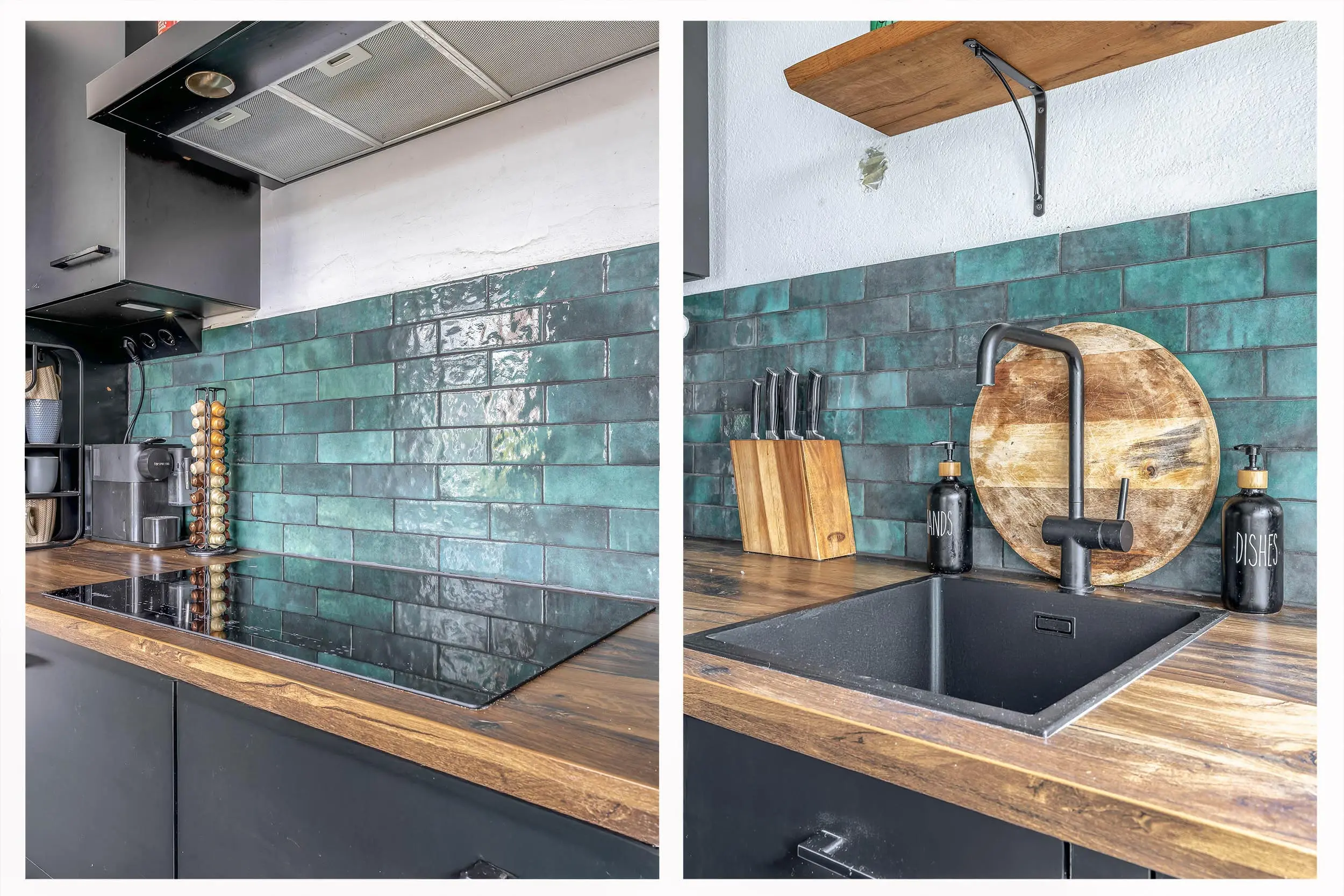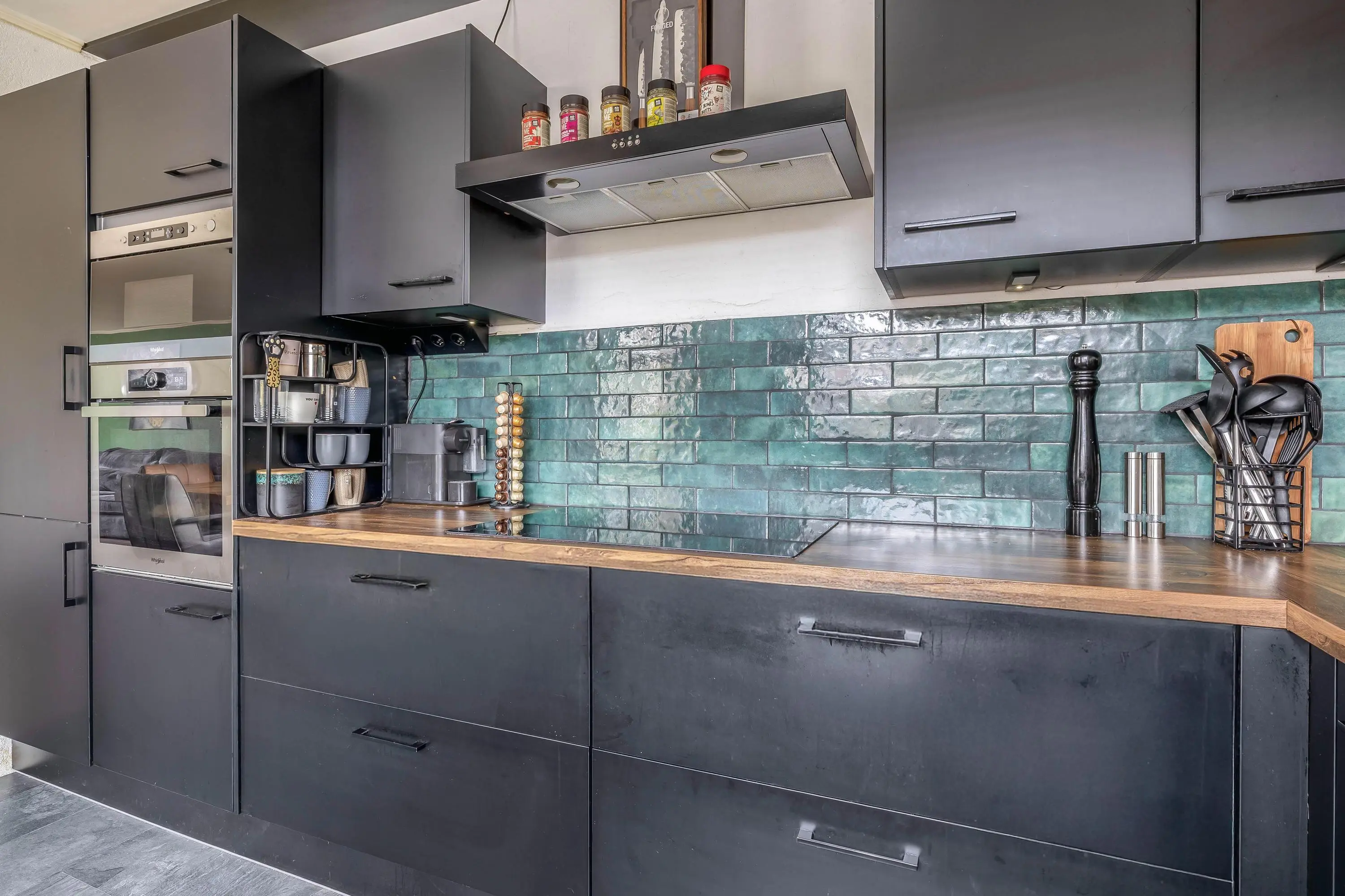 De keuken is in 2020 geplaatst en uitgevoerd in een moderne, zwarte stijl met een houten werkblad. De keuken is van alle gemakken voorzien: een inductiekookplaat, afzuigkap, combimagnetron, oven, close-in boiler, vaatwasser en koelkast. Via een deur in de keuken heeft u direct toegang tot de achtertuin.