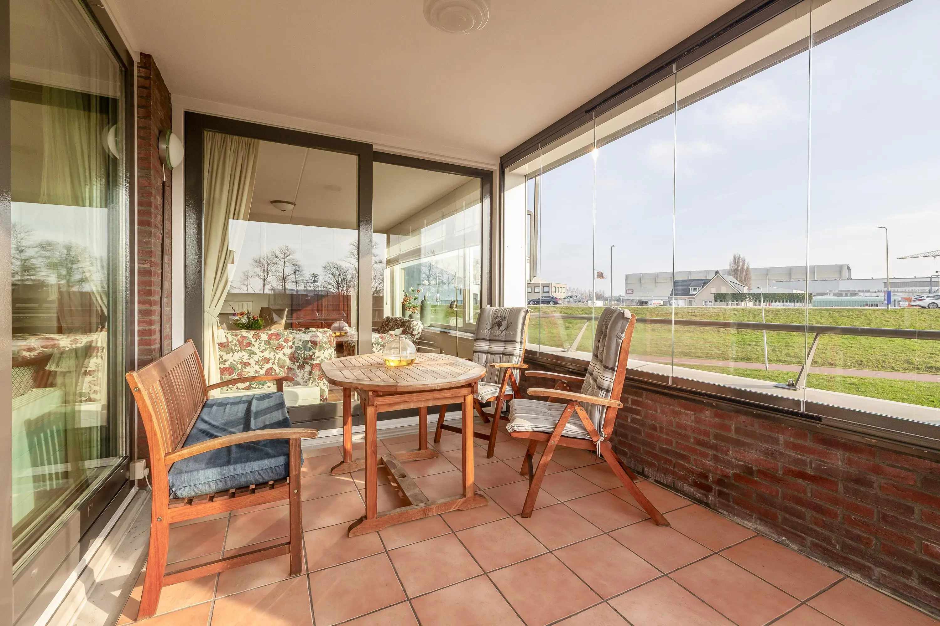 Via het gesloten portiek is met de trap of lift de tweede etage te bereiken. De entree in de woning is in de hal/gang. Vanuit de hal is er een vlizotrap naar een zeer ruime en praktische bergzolder. Daarna als eerste de meterkast en tevens de grootste slaapkamer. Een mooie ruimte met grote raampartijen en een airco-unit. Dan volgen rechts de tweede en derde slaapkamer. Beide erg goed te gebruiken als slaapkamer, werkkamer of kastenkamer. Tegenover deze kamers is een inpandige berging aanwezig met daarin de C.V.-ketel en de wasmachine aansluiting. Daarnaast bevindt zich een losse toiletruimte met wandcloset en fonteintje. Ook is de badkamer in deze hoek te vinden. Deze heeft als sanitaire voorzieningen een wastafel met meubel, extra toilet, ligbad, inloopdouche en designradiator. En dan is de doorgang naar die heerlijke woonkamer. Een zeer royale ruimte met meer dan voldoende plek voor een eethoek en een gezellig zitgedeelte. Door de enorme hoeveelheid glas komt er veel natuurlijk daglicht naar binnen en is er mooi zicht op de dijk en daarna het water. De open keuken is ook via de woonkamer bereikbaar en is in een hoekopstelling voorzien van een divers aanbod aan apparatuur. Denk dan aan een koel-/vriescombinatie, oven, inductiekookplaat met afzuigkap, dubbele spoelbak, vaatwasser en voldoende kastruimte. Aan deze kant is ook weer een raam aanwezig. In de keuken is middels de grote schuifpui het terras te bereiken, in de woonkamer is een zelfde pui aanwezig. Het terras is gelegen op het zonnige zuiden en door extra glaspanelen ook met kouder weer te gebruiken. Wat een fijne plek om dagelijks te genieten van de rust in deze omgeving!