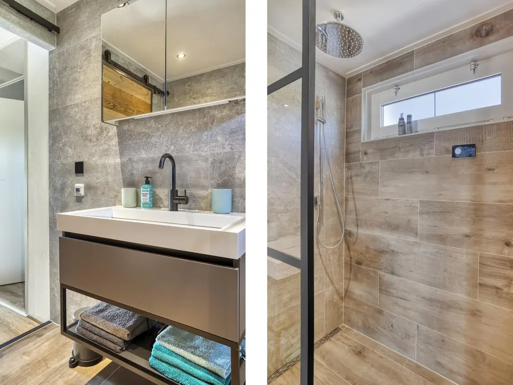 De moderne badkamer is stijlvol afgewerkt en voorzien van vloerverwarming, een inloopdouche, toilet, wastafelmeubel en een designradiator.