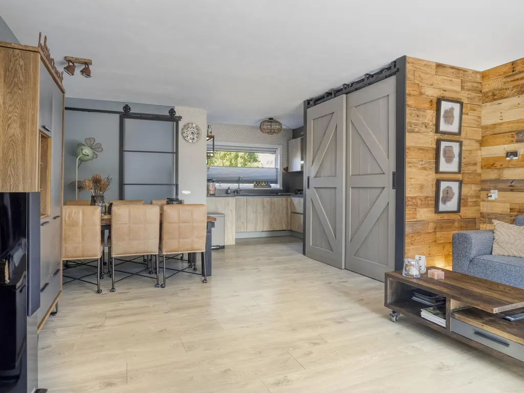 Bij binnenkomst in de woning betreedt u de hal met meterkast, die toegang biedt tot het separate toilet, de berging en de leefruimte via een moderne zwarte stalen schuifdeur. De leefruimte is licht en ruim opgezet, met een nette laminaatvloer voorzien van comfortabele vloerverwarming. Er is voldoende ruimte voor zowel een gezellige zithoek als een royale eethoek, en dankzij de schuifpui aan de achterzijde is er direct toegang tot de zonnige tuin, wat zorgt voor een fijne verbinding tussen binnen en buiten.