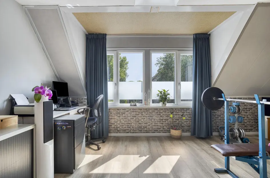 Op de tweede verdieping komt u via de overloop bij de cv-installatie, de omvormer voor de zonnepanelen en de aansluitingen voor de wasmachine. Aansluitend vindt u hier de derde slaapkamer, met een oppervlakte van circa 12m². Deze kamer is netjes afgewerkt met een laminaatvloer, behangen wanden en beschikt bovendien over een eigen wastafel.