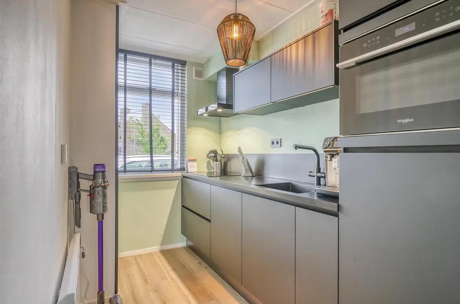 Aan de voorzijde van de woning vindt u de schitterende keuken. Deze keuken is vorig jaar geplaatst en bestaat qua apparatuur uit een inductie kookplaat, afzuigkap, koelkast, combimagnetron, vaatwasmachine en een Quooker.