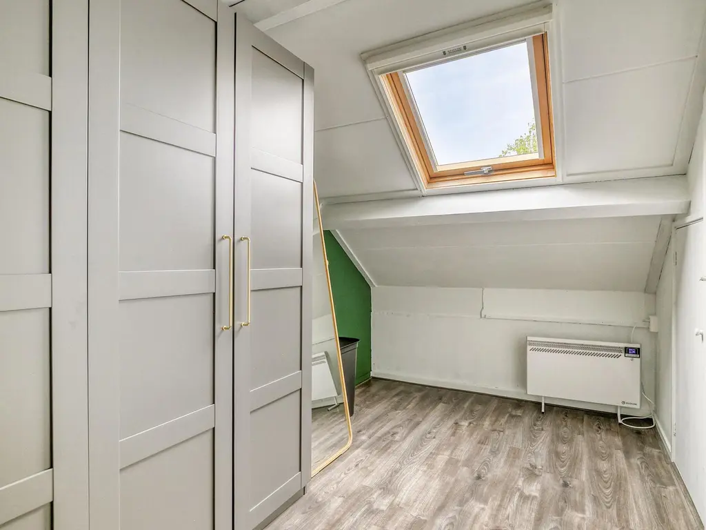 Slaapkamer 2 ligt aan de achterzijde en is eveneens voorzien van een vaste kast. Lichtinval geschiedt middels een dakraam en de oppervlakte is ongeveer 6m².